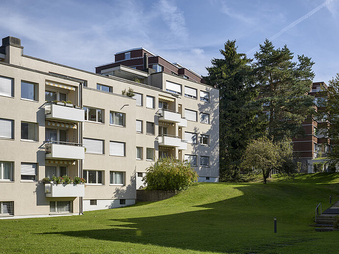 Die Liegenschaft befindet sich am Stadtrand und ist umgeben von Feldern, Wald und Wiesen. Auf 613 Metern über Meer gelegen, ist sie die am höchsten gelegene PWG-Liegenschaft. Mit dem Bus gelangen Sie im Nu ins Quartierzentrum und auch direkt weiter in die Innenstadt. Die ursprünglichen Häuser liegen im hinteren Teil des Grundstücks, die zwei Neubauten etwas erhöht an der Strasse. Der Ausbau entspricht dem jeweiligen Erstellungsjahr.