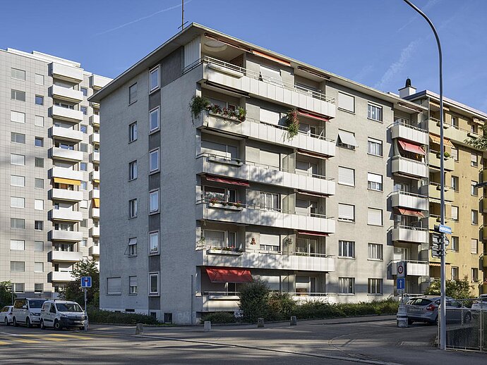 Nicht neun Brunnen waren es, die der Strasse ihren Namen gaben, sondern ein einziger. Denn aus «Neubrunnen» wurde im Laufe der Zeit «Neunbrunnen». Das «n» zu viel schadet der Qualität der Lage jedoch nicht: Das Tram hält um die Ecke, zum Bahnhof Oerlikon sind es knapp 10 Minuten zu Fuss. Trotz städtischer Lage ist es erstaunlich ruhig, und die Wohnungen sind recht gut besonnt; sie erhalten Licht von zwei Seiten. Alle haben einen Balkon. Es ist ein Lift und eine Tiefgarage vorhanden.