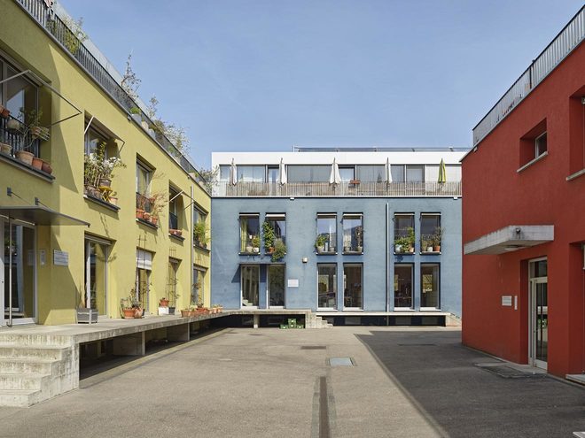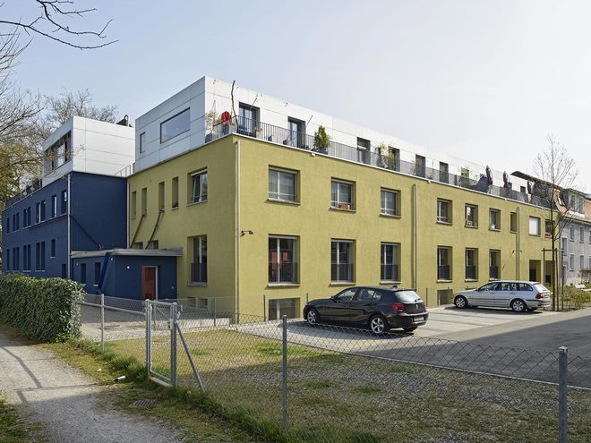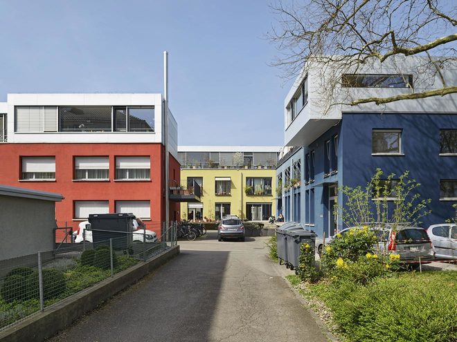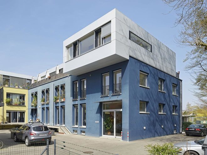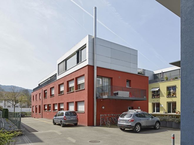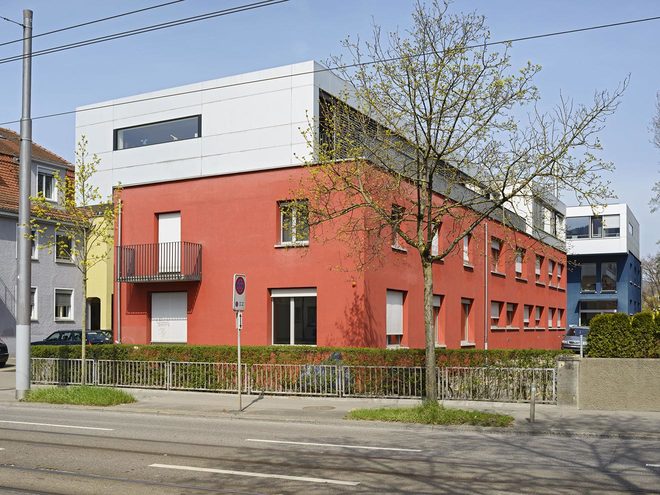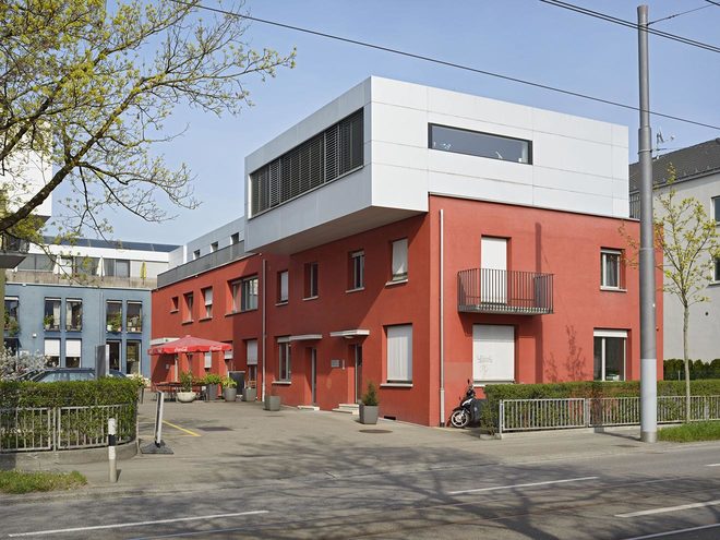 Die einstige Farbenfabrik H. Boller-Benz am Hubertus bauten wir 2003 zu einem Wohn- und Gewerbehaus um. Von der Strasse zurückversetzt, ist die Liegenschaft gut vor Verkehrsimmissionen geschützt. Ausbau und Ästhetik zeichnen sich durch klare Linien und gezielte Farbakzente aus. Alle Wohnungen besitzen einen grosszügigen privaten Aussenraum. Im Erdgeschoss wird gearbeitet, darüber gewohnt.