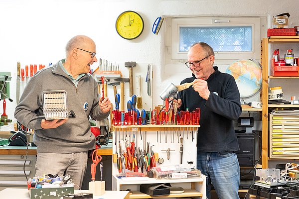 Durch zwei Mini-Fenster fällt Tageslicht in den kleinen Keller im Souterrain. Rolf zeigt auf den Boden. «Die langen Bodenbretter da vorne haben wir aus einem Abbruchhaus übernommen und die breiten Pressholzplatten unter uns standen vorher als Zwischenwände hier drin.» Mit Rolf ist man grundsätzlich per Du, genau wie mit seinem Kollegen Toni. Die beiden Pensionäre sitzen an Rolfs Arbeitsplatz – es ist einer von fünf. Die Tische und Stühle sind zusammengewürfelt. Die unzähligen Werkzeuge an der Wand und die Werkbank «alles secondhand», sagt Rolf. Er ist Präsident des Vereins «Reparaturia», den er 2021 zusammen mit Toni gegründet hat.