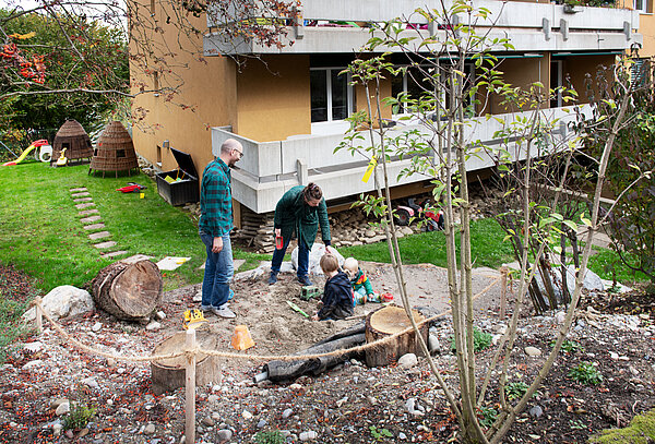 Die beiden Buben der Mietenden Katharina Steiner und William Bausman spielen gerne im neuen Sandkasten. «Er ist wirklich schön geworden», sagt Katharina Steiner. Oftmals fehle bei solchen Spielplätzen der Schatten. «Aber hier können die Bäume und Pflanzen jetzt wachsen und Schatten spenden.» Doch der neu gestaltete Sandkasten am Schürliweg 2 und seine Umgebung sollen viel mehr bieten als eine Sändeli-Gelegenheit für die Kleinen. «Er bildet mit der Umgebung im Hintergrund eine Ruderalfläche», sagt Boris Ercegović: eine brach liegende Rohbodenfläche aus Kies, Sand oder Erde, wie man sie als Pionierflächen oft an natürlichen Fluss- ufern findet. Hier können spezialisierte Pflanzen wachsen, die nur auf solchen Brachflächen vorkommen. «Indem Einwohnende und insbesondere Kinder den Raum am Rand des Sandkastens nutzen, wird er erst gestaltet», erklärt Ercegović. «Solche Lebensräume entwickeln eine Eigendynamik, die unser Siedlungsraum ansonsten nicht zulässt.» Genau solche offenen, gestaltbaren Flächen würden von Kindern eines breiteren Altersspektrums genutzt und seien aus entwicklungspsychologischer Sicht wichtig. Quer liegende Eichenstämme aus dem Züriwald, Findlinge sowie heimische Gewürz- und Heilpflanzen am oberen Rand sollen die Fantasie und die Entdeckungslust der Kinder wecken.