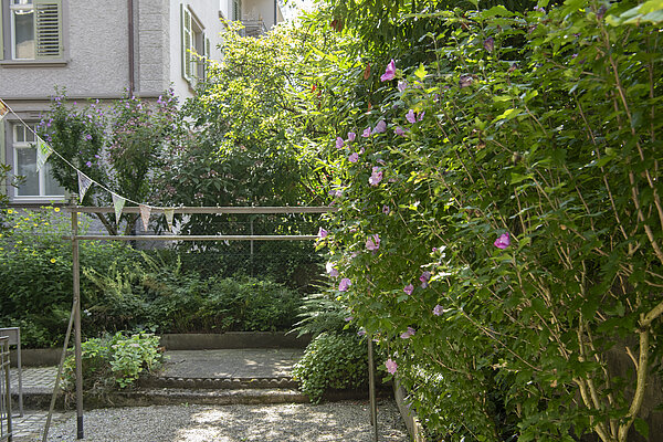 Invasive Neophyten, also gebietsfremde Pflanzen, die die heimische Flora verdrängen, sind in der Stadt immer häufiger anzutreffen. Auch dem Beet, das die Süd- und Westseite der Liegenschaft an der Forchstrasse 290 flankiert, wurden Neophyten wie die Kanadische Goldrute oder der Schmetterlingsflieder zum Verhängnis. Das Beet hatte insgesamt wenig Pflanzenvielfalt zu bieten. Inzwischen haben Blühpflanzen für Bestäuberinsekten Einzug gehalten. Am schattigen, feuchten Standort wachsen nun von Straucheibisch, Gefleckter Taubnessel, Grosser Sterndolde bis hin zu Blutweiderich und Klebrigem Salbei wertvolle Wildstauden mit typischem Waldcharakter. «Das Beet ist sehr pflegeleicht und bietet Nahrung und Nistmöglichkeiten für Wildbienen, Schmetterlinge und andere Bestäuberinsekten», erklärt Boris Ercegović. Solche kleinen Refugien sind gerade für Insekten, die lediglich kurze Strecken zurücklegen können, als Trittsteinbiotope von grossem Wert. Auch die Mietenden geniessen den neuen Strauchwald vor der Tür. «Mich freut es sehr, dass wir ein neues und wichtiges Habitat für Pflanzen, Insekten und Kleintiere geworden sind», sagt Mieterin Nicole Steger. Fast täglich lässt sie ihren Blick über das lange Beet schweifen. «Ich beobachte ein erhöhtes Aufkommen an Bienen, Hummeln und Schmetterlingen, die sich am Nektar der Blumen laben. Zudem scheint sich auch unsere Haus-Maus Mathilda gänzlich wohlzufühlen.»